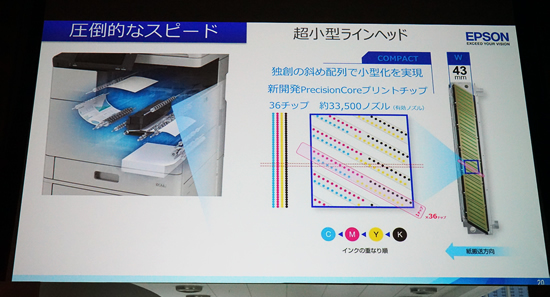 セイコーエプソンによると、多くのインクジェットプリンタが採用するシリアルヘッド方式では、印刷中に紙が止まる瞬間がある。一方、ラインヘッド方式は、紙幅いっぱいに配置されたノズルがインクを噴射し、紙を止めずに印刷できるため、今までにない印刷速度が体感できるという。