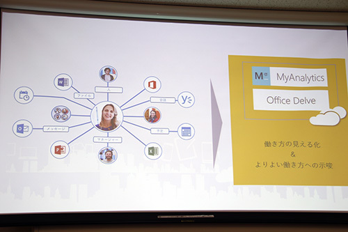 「MyAnalytics」は、働き手の時間の使い方や他部署との接触回数などを可視化する。働き手はこれを振り返り改善することで、業務を効率化していく仕組み。(BCNメディア編成部)
