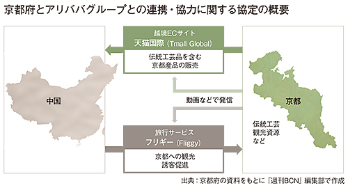 この協定による具体的な連携については、伝統工芸品を含む京都の産品をアリババグループの越境ECサイト「天猫国際(Tmall Global)」で販売したり、アリババグループの旅行サービス「フリギー(Fliggy)」を通じて、中国人の京都への観光を促したりする。販売や観光のどちらに関しても、単にサイトで産品やツアーを掲載するだけでなく、京都の魅力をアピールした動画の活用など、ユーザーが産品の購入やツアーへの参加に興味がわく仕組みを構築することにしている。