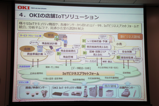 「IoTビジネスプラットフォーム」は、OKIの強みであるセンサネットワークとセキュリティ技術、AIを組み合わせたソリューション。店内にさまざまなセンサを配置し、得られたデータの分析結果から、戦略の見直しや業務改善につなげる仕組みになっている。