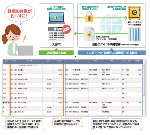 応研が無償提供する大臣フィンテックサービスは、インターネット経由で金融口座から入出金明細データを取得し、AIが自動で仕訳データを作成する。金融機関から情報を取得する機能は、イー・アドバイザーが提供する口座管理サービス「MoneyLook」を採用している。経理業務で負担を強いられる入出金処理業務などを効率化できるほか、仕訳作成の自動化で起票漏れや二重起票、入力ミスなどを防止することができるという。