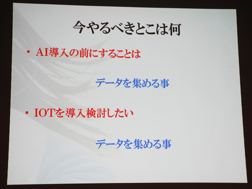 渡邊氏は、具体的に何から始めるべきかについて、「極端にいえば、IoTでデータを集め、この集めたものをAIに入れることで初めて分析が可能となるが、そもそもオラクル、SQLサーバー、手組みなどが混在しているデータ統合から始めることが多い。1か所に集めて、そこにためて初めて分析につながる」と、まず最初の一歩としてビッグデータの作成が急務であると訴えた。