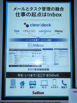情報セキュリティEXPOに出展し、働き方改革をテーマとした新製品を展開していたのはソリトンシステムズ(ソリトン)だ。5月10日に販売を始めた働き方改革を支援する新製品「ClearDeck」は、Office 365など外部のクラウドサービス機能を利用し、統合、連携するマルチOS対応のワークスペースプラットフォーム。メールをはじめとした個人のさまざまなタスク管理を、デバイスを問わず共通のインターフェースから行うことができる。コンテナ技術を採用することで高いセキュリティを確保するクラウドサービスとして提供する。10ユーザーの場合で月額1ユーザーあたり1000円、1000ユーザーの場合では月額1ユーザー650円。いずれも1ユーザーにつき5デバイスまで利用できる。