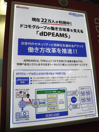 同様にセキュリティEXPOに出展し、働き方改革に大きくフォーカスしたのはドコモグループでグループ内システムを手掛けているドコモ・システムズだ。Japan IT Weekには今回が初出展。メール、スケジューラ、社員録などの基本的なツールに加え、社内外でのWeb会議機能や勤怠、経費の申請・承認など、多くの機能をドコモならではのモバイル機能で提供するクラウド型企業情報システム「dDREAMS」をはじめ、クラウド型Web会議サービス「sMeeting」、運行管理業務を総合的に支援する法人向けクラウドサービス「docoですcar」を展示した。