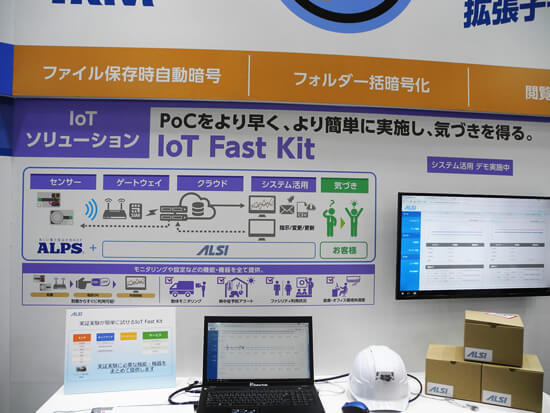 ALSIはセキュリティ商材をブースで展示する一方で、IoTの実証実験を素早く簡単に始めることができる期間レンタル型ソリューション「IoT Fast Kit」を参考出展した。傾きや動き、温度、気圧、湿度などをセンサひとつで取ることができ、そのデータを蓄積し、ユーザーが気づきやすい形のレシピとして提供、確認できるようにした。また、ALSIが今まで展開してきたファームウェアソリューションの強みを生かし、センサからデータを送るだけでなく、WEBからセンサのコントロールを可能とした。