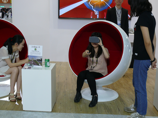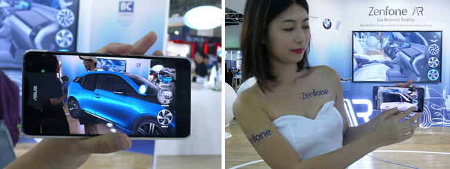 また、バーチャル体験を実現するAR技術「Tango」とモバイルVRを実現するGoogleのプラットフォーム「Daydream」に対応したスマートフォン「ZenFone AR」のコーナーでは、その場にいるかのようなゲームが楽しめることをアピール。何もない空間で端末を介して自動車を試乗するかのように体験できるなど、用途の拡大を訴えていた。(佐相彰彦)