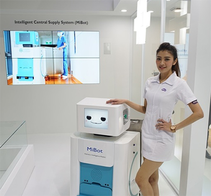 2010年以降、医療関連ビジネスの本格化を図ったベンキューのブースで目立っていたのは、自動で医療器具を運搬することに特化したロボット「MiBot」。病院内では、緊急のオペが行われるケースがあり、その際、医療器具を迅速かつ正確に運ぶ必要がある。このような問題を解決するのにMiBotは役立ち、また人手不足の解消にもつながるのだ。