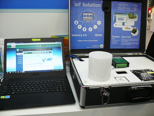 「Taiwan IoT Expo 2017」のブースでは、台湾ベンダーによるハードウェアとソフトウェアを組み合わせたソリューションが充実。台湾でSIを手がけるIESS CLOUD TECHNOLOGYは、パッケージ化したIoTセンサとデータ分析可能なソフトウェアを展示。センサを搭載した機器のデータをソフトウェアで吸い上げて分析するため、そのパッケージを導入すれば電力や製造工程などの「見える化」を実現するという。