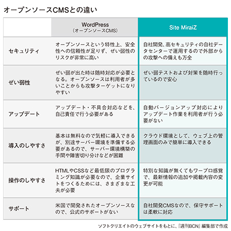 ソフトクリエイトは、ECサイト構築支援のかたわら、顧客の求めに応じてコーポレートサイトの構築にも取り組んできた。ここ数年で実績が増えてきたことから、本格的にCMSの市場に参入することを決定。新製品としてSiteMiraiZを打ち出し、4月から提供している。