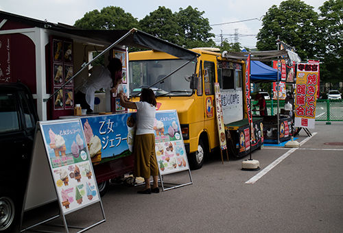 会場の外では、地元のB級グルメである餃子や焼きそばなどが食べられるコーナーがある
