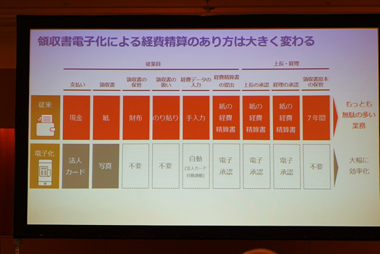 三村真宗社長は、「われわれの調査では、サラリーマンは生涯で12時間を領収書の糊貼りに使っている。この領収書を、離れた場所に持ち運んだり、郵送したりするには手間やコストもかかる」と説明し、「経費精算は最も面倒な業務で、働き方改革で真っ先に着手すべきテーマ。領収書の電子化で、経費精算のあり方は大きく変わる」と強調した。