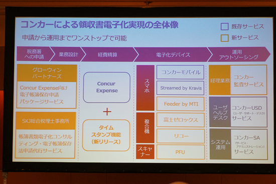 サービス群は、領収書の画像をコンカーのクラウドサービス「Concur Expense」で管理するのが特徴。OCR機能での文字認識や、AI(人工知能)による経費種別の補正ができるメニューなどを用意。Concur Expenseに画像を取り込む際、タイムスタンプは自動的に押されるため、写真を撮るだけで経費入力を自動化することも可能だ。