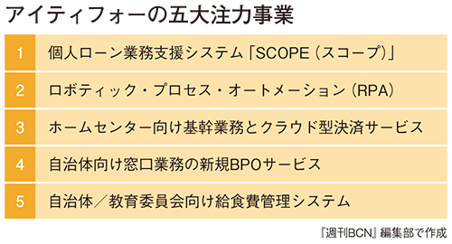 四つめ、五つめは、いずれも自治体関連で、自治体の窓口業務のBPOや学校給食費の収納管理システムの商談を加速させていく。従来は国民健康保険などの督促といった収納代行BPOサービスを手がけてきたが、これをさらに推し進めて、保険や税務に関する収納窓口そのものを請け負う商談を進めている。また学校給食費はこれまでは学校ごとに徴収していたが、教職員が教育活動に専念できるよう、近年では自治体が徴収業務を行う動きが本格化。アイティフォーでは向こう3年でおよそ100団体からの受注を目指している。(安藤章司)