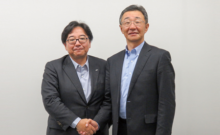 ソニックウォールの藤岡健社長(右)とダイワボウ情報システムの松本裕之取締役 販売推進本部長
