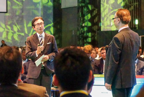 ゲストスピーカーとやりとりする小出伸一会長兼社長(左)