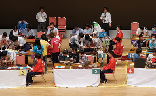 「高専プロコンの華」といわれる競技部門は、前回に引き続いて枠の中にピースをはめて絵柄を完成させるパズルゲームを採用。大ホールのステージでライバル校と机を並べ、縦21.0cm、横29.7cmの枠に、多角形のピースを制限時間内にすべて並べてパズルを完成させる早さと正確さを競った。各チームは、PCやスキャナ、カメラなどを駆使してピースの形状を取り込み、用意したプログラムで組み合わせや配置場所を模索。減点にはなるが、ヒントとして活用が認められたピースの形状情報や配置情報などを手がかりに、完成への道筋を探った。