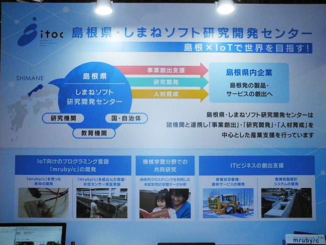 藤井基礎設計事務所と手掛けた雨量・水位センサの実証実験で使用されている開発言語「mruby/c」は、ITOCと九州工業大学で共同研究開発を行っているという。従来のRubyより軽量で動くRuby(mruby)と比べ、大幅な小型化と省電力を実現。しまねソフト研究開発センターの太田敬二主任は「今回の実証実験は河川で行っているが、そもそも作業現場は電源が確保できない場所が多い。リリースして間がないため、事例は少ないが、省電力であり乾電池で動くmruby/cはIoT時代のデバイスに組み込みやすい言語となっている。mruby/cの普及を実現させることで、IoTから地域の課題を解決したい」と、島根発のmruby/cが目指す世界を語った。