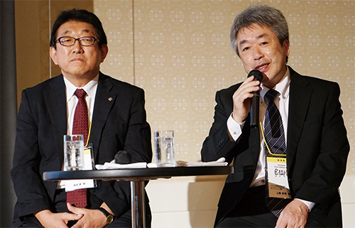パネルディスカッションで発言するアイテック阪急阪神の上西部長(右)と