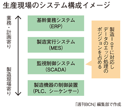 同社は生産設備の監視制御システムを手がけており、この監視システムをエッジに見立てて、積極的に活用する。生産設備からは日々大量のデータが発生しており、IoTなどで活用するには、まずはデータを整理し、わかりやすいよう見える化する前処理を行う必要がある。この前処理を監視システムに担わせることで、「データの有効活用につなげていく」(岡下秀典・企画販推部企画販推課課長)戦略だ。
