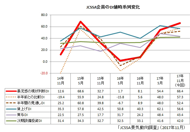この要因として、JCSSAでは、国内経済は好調ながらも、朝鮮半島情勢など不安定要素から賃金や賞与などに関して前回を下回る結果になったと分析している。