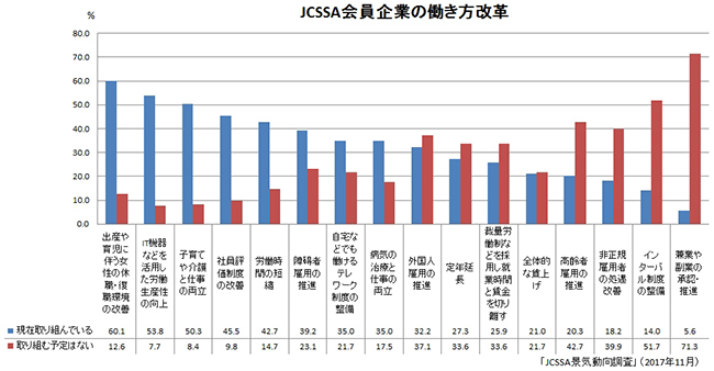 今回の調査では、働き方や暮らし方の見直し機運の高まりを受け、JCSSA会員企業の働き方改革についても聞いた。「現在取り組んでいる」企業がもっとも多かったのは「出産や育児に伴う女性の休職・復職環境の改善」で60.1%。次いで「IT機器などを活用した労働生産性の向上」(53.8%)、「子育てや介護と仕事の両立」(50.3%)などだった。逆に「取り組む予定がない」ものとしては「兼業や副業の承認・推進」が71.3%で最多。「高齢者雇用の促進」(42.7%)、「非正規雇用者の処遇改善」(39.9%)なども多かった。また、働き方改革に取り組むにあたっての障害については「新しい働き方に沿った評価制度の整備が困難」(51.0%)で突出。実施にあたっての問題点も浮き彫りになった。