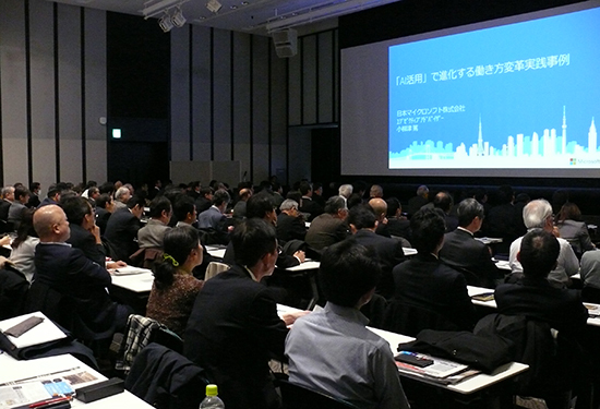 基調講演では、テレワーク普及推進施策の一つ「テレワーク月間」で実行副委員長を務める日本マイクロソフトの小柳津篤・マイクロソフトテクノロジーセンター エグゼクティブアドバイザーが登壇し、「『AI活用』で進化する働き方変革実践事例」と題して各社員や各部門が主体的に変革を継続している日本マイクロソフトの現在の働き方を、実例を交えて紹介した。