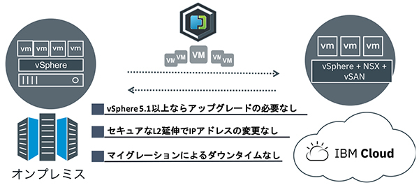 「VMware Hybrid Cloud Extension (HCX) on IBM Cloud」のイメージ図。出典:日本IBM