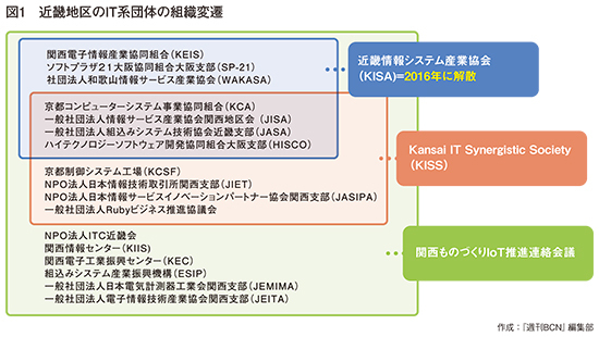 昨年8月、近畿経済産業局(近経局)が主導し「関西ものづくりIoT推進連絡会議」が発足した。同会議には、IT関連団体、電機計測器関連団体、電子機器・電子部品関連団体などから17団体が加わった。16年8月までは、大阪、京都、和歌山にある地域のIT関連7団体で構成する「近畿情報システム産業協会(KISA)」が近経局との連携や業界団体間の事業推進役として存在していたが、16年に解散。これに変わる組織として、ソフトウェア開発の関連8団体で、同時期に「Kansai IT Synergistic Society(KISS)」が発足している。