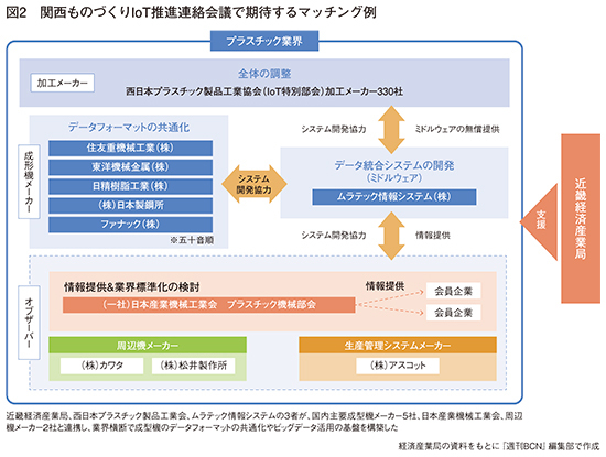 情報サービス産業に関していえば、近畿地区は首都圏に次ぐ売上高を上げている市場だ。しかし、各ITベンダーの事業規模は小さく、首都圏などの大手ITベンダーの下請けで売り上げを賄っている傾向が強い。近経局では、「近畿圏は、組込み・制御ITベンダーの集積地であり、この特色を生かす」(森下課長)としているが、地元ITベンダーにその認識は薄い。IT業界団体幹部に聞くと「集積地とは思っていない」との返答がくるほど。IT業界間でも、ソリューション系と組込み・制御系ベンダー間の連携性が薄いのが実情のようだ。ただ、全国的にみても、大手電機を中心とした製造メーカーが多く存在する近畿圏では、IoT関連の需要が高いことが予想される。こうした企業から需要を取り込むうえで、中小規模のITベンダーが1社だけで、あるいは小規模団体だけで、案件発掘することには限界がある。近経局が業界横断でマッチングしたIoT推進例として挙げているのは、16年度に同局の「スマート工場実証事業」で実現したプラスチック業界が、共同で取り組んだIoTシステム導入だ(図2)。この取り組みには、近経局、西日本プラスチック製品工業会、成形業向け生産管理システムなどを提供するムラテック情報システムの3者が、国内主要成形機メーカー5社、日本産業機械工業会、周辺機メーカー2社など、横断的な業界が参加した。森下課長は、「プラスチック業界では、複数メーカーの成形機を使って製造している。高精度な製品製造を実現するには、成形条件情報などの把握や収集、活用が重要だ。だが、成形機のデータフォーマットがメーカーごとに異なり、中小企業の多い業界側では収集などに限界があった」と、業界横断でビッグデータを収集・活用する仕組みができ、生産効率を上げるための下地ができたとしている。