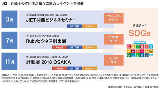 ここ数年、IT業界団体が連携して新たな需要を創出するため、近畿の団体間が共同でイベントなどを開催するケースが増えている。今年は、日本情報技術取引所(JIET)関西支部、Rubyビジネス推進協議会、日本電気計測器工業会(JEMIMA)関西支部の3者が、各団体主催で開催するイベントに相互に参画する計画だ(図3)。この連携イベントを主導するのは、JIET関西支部の支部長でRuby協にも参画する石丸博士・リバティ・フィッシュ社長。2年ほど前から、JIET関西支部のビジネスセミナーでは、他団体との連携を実現していたが、今回の場合、3団体が共通テーマを掲げ、それぞれのイベントでテーマに沿った展示やセッションを設ける。共通のテーマは、現在大阪・関西が誘致している「国際博覧会」でテーマとして掲げている「SDGs(持続可能な開発目標)」を設定した。同博覧会では、SDGsの達成に貢献するうえでの日本や世界の取り組みが主要テーマになる。石丸社長は、「SDGsをテーマに、エネルギー、自然環境、高齢者・障がい者福祉などの観点で、IT業界からアイデアを出したい」と話す。