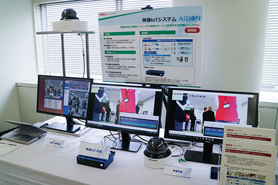 また、光ファイバーを使った新商品としては、「分布型温度・歪みモニタリング」というソリューションを公開。光ファイバー上の温度・歪み分布を可視化する先進技術で、トンネルや橋脚、ダムなど、広範囲を点検する必要がある社会インフラの常時監視を実現する。「多数の電気式センサを敷設するよりも導入コストを低減でき、早期の異常検出が可能だ」という。現在、実証実験用の評価キットを提供中だ。業務改革ゾーンに展示された新商品のうち、映像IoTシステム「AISION」は、OKIのメカトロの技術を応用し、H.264符号化形式の高画像映像データを大幅に圧縮する映像配信の効率化技術を備えるほか、顔認識、物体認識など画像センシング技術を搭載する。「店舗の窓口・レジの混雑予測や優良顧客の認識で顧客サービスを向上したり、工事現場で危険エリアに作業員が侵入した際の警報通知ができるなど、用途は多様だ」と、小売店舗や電力会社、空港などに売り込む。