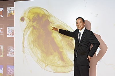 背景に映るのはデジタル顕微鏡で拡大表示したミジンコ
