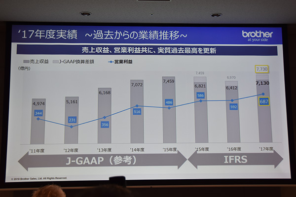 基調講演で三島社長は、5月9日に発表したブラザー工業の2017年度実績を改めて解説。「売上収益は前年度比11.2%増の7130億円、営業利益は16.1%増の687億円と、売上収益、営業利益とも過去最高に達した。全事業、全地域でいい数字を残すことができた」と話した。