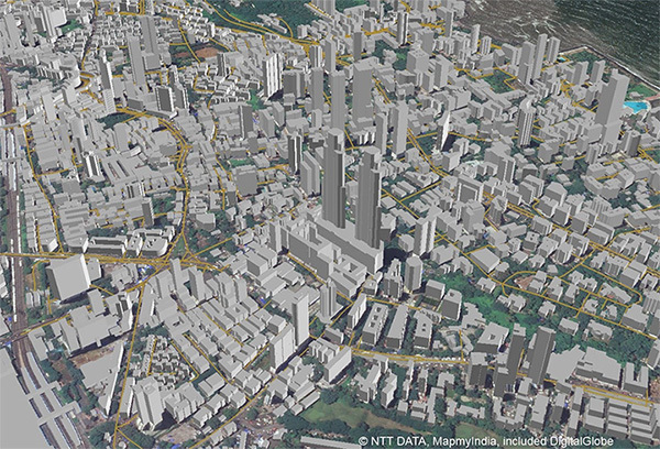 NTTデータによると、3D地図は、現地で測量をせずに効率的に地形を分析できるのが特徴。経済成長が著しいインドでは、インフラ整備などで高精細な3D地図の需要が高まっているという。