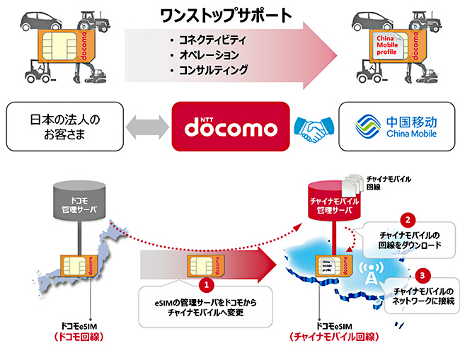 NTTドコモによると、日本から中国に製品を輸出している企業が、機器に組み込んだドコモのSIMを抜き差しすることなく、中国でチャイナモバイルのネットワークに切り替えられるのが特徴。切り替え前後の保守や運用は、ドコモがサポートする。