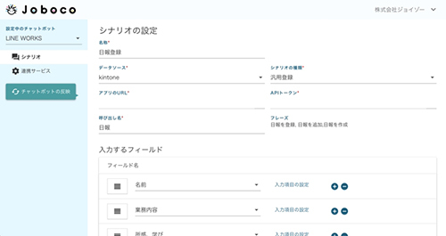 Jobocoは、LINE WORKSやslack、chatworkなどの主要なチャットサービスと、サイボウズの業務アプリ構築クラウド「kintone」との連携によってチャットボットを実現するサービス。あらかじめ設定したシナリオに合わせてkintoneから情報を取得し、チャットに自動で返信したり、kintoneに情報を登録したりすることに対応する。