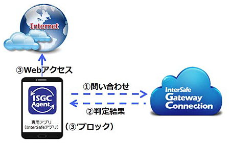 今回のアップデートでは、スマートデバイスのセキュリティー対策を強化した。具体的には、専用アプリ「ISGC Agent」をインストールすることで、スマートデバイス(iOS、Android)の標準ブラウザーや業務システムなどに搭載されるアプリ内ブラウザーでのウェブフィルタリングを実現する。フィルタリング専用ブラウザーは不要なため、既存の業務システムの利用を妨げることなく、スマートデバイスで抜け漏れのないウェブフィルタリングが利用できる。