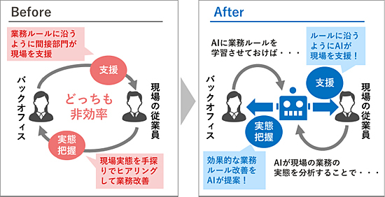今回開発した製品シリーズは、既存の基幹業務システムに手を加えることなくAIが業務ルールを学習し、申請者の入力や承認者のチェックを支援することで、バックオフィス業務の効率化を実現するもの。同時に、各業務にかかる時間や業務ルールの理解度といった現場業務の実態を定量的に取得・分析することもできるため、改善すべき点をAIが学習し提案する。