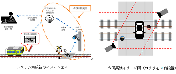 この実証実験のシステムでは、踏切に設置された監視カメラの映像から踏切内の異常をAIを用いた映像解析プラットフォーム「SCORER」で検知し、付近を走行中の電車の運転士や運行管理者などに、警告とともに映像を2秒以内に伝送することを目標としている。