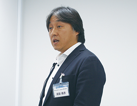 次に登壇したBlackBerry Japanの高梨義彦氏は、コミュニケーション系やオフィス系アプリケーションなどと連携し、モバイル端末上で利用可能にする「BlackBerry Work」と、セキュアファイル共有ソリューション「BlackBerry Workspaces」を紹介し、デモンストレーションを行った。高梨氏は「誰が、何を、いつ、どこで、どのように、を押さえる。これがWorkspaces」と説明し、外部に送ったファイルを管理する方法をはじめ、Workspacesの機能を紹介した。