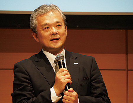 今回のテーマは「業務改善とセキュリティ、“三段跳び”で飛躍!!働き方改革2020」。開会の挨拶で永倉社長が登壇したほか、プロゴルファー兼タレントのタケ小山氏による特別講演と三つのセッションが行われた。