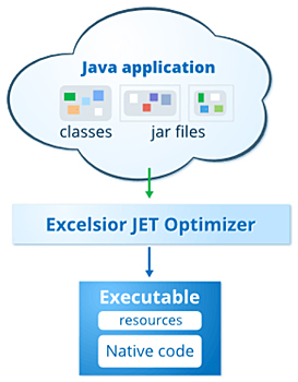 Excelsior JETは、Javaアプリケーションを高速化し、Javaをリバースエンジニアリングから保護するソリューション。Javaアプリケーションを最適化した実行ファイルとして配布することができる。Windows、Linux、OS Xに対応しており、JavaアプリケーションやコンポーネントであるクラスファイルをWindows上ではEXEとDLLファイルに変換し、また、Linux、OS X上では実行ファイルと共有オブジェクトに変換する。