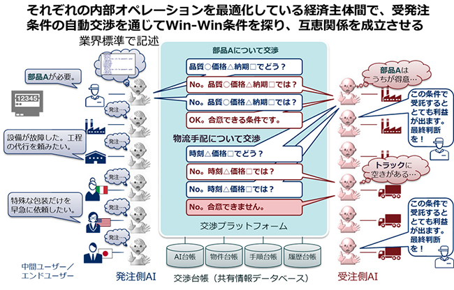 研究開発では、AIが交渉プラットフォームを介して、数百・数千という企業の中から、取引先候補を探索したり、発注者と受注者の双方が合意できる価格や納期を探索したりなどを想定している。取引条件の探索は、標準化されたプロトコル、データ形式、語彙定義を用いて、相互に取引条件案の提示と受諾可否の回答(交渉)で実行され、双方合意できる条件が発見できた場合、契約するかどうかの最終判断を人間に仰ぐ。成立した契約は、製造現場や物流現場で履行される。