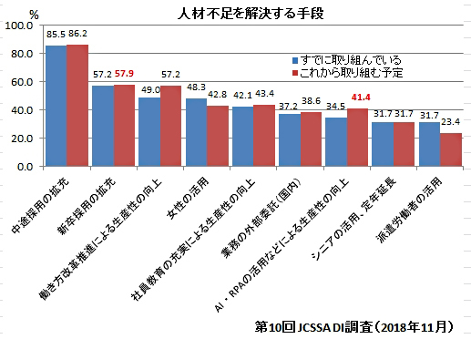 不足している技術系人材の内訳は、プロジェクトマネジャーやネットワーク系の人材が過半を占め、開発系も5割弱を占めた。対策として、中途や新卒などの採用でまかなうとした回答が上位を占めたが、「働き方改革推進による生産性の向上」も49.0%となり、3番目に多かった。今後取り組む予定では、同様に中途(86.2%)や新卒(57.9%)が上位を占めたが、働き方改革も57.2%に達し、AI・RPAの活用も41.4%と4割を超え、生産性向上への期待の高さが浮き彫りになった。