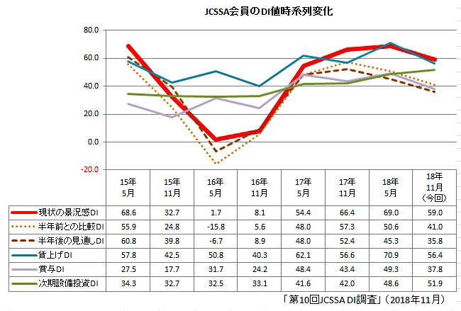 JCSSAでは「国内経済は回復基調は続いているものの、7-9月期の実質GDP成長率はマイナス0.3、年率換算でマイナス1.2と回復にブレーキが掛かり始めている。同期の名目GDPも550兆円と頭打ちになってきた。足元では、米国のトランプ大統領が仕掛ける米中貿易戦争に端を発する経済縮小と日本への影響を懸念する見方もあり、ディフェンシブな空気がより濃くなってきた」と分析。しかし、今回の調査は、10月10日に発生した米株暴落の影響が残る中で実施されており、伸び悩み始めた回復の足取りと株価、さらにその要因ともなった貿易環境の悪化懸念がDI値を押し下げ、先行きの不透明感も増した、としている。