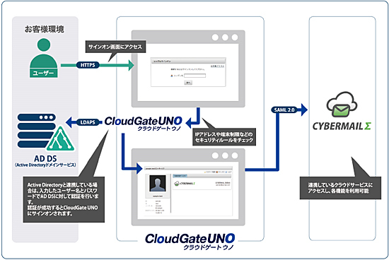 また、CloudGate UNOと連携する他のクラウドサービスとのシングルサインオン(SAML認証)が可能。一度、CYBERMAILΣにCloudGate UNOを経由してログインすることで、連携する他のクラウドサービスへ同時ログインができるため、シームレスにアクセスすることができる。