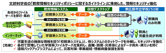 各校で管理していた「学習系システム」用のファイルサーバーを、東広島市教育委員会が管理するセンター側に集約して一元管理することで、セキュリティーと信頼性を向上した。また、センター側では「校務系システム」と「学習系システム」の双方にファイルサーバーを設置することで、機密情報は「校務系システム」のファイルサーバーに保存し、学習教材等の非機密情報は「学習系システム」に保存するなど、情報の機密度に応じたアクセス権限の分離を実現した。さらに、ファイルサーバーとアクセス権限を一元管理することによって、異なる学校間の教職員の情報共有も実現し、よりコラボレーションが促進可能な環境を構築した。