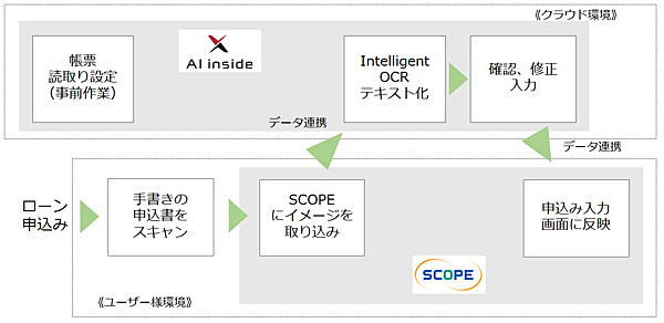 アイティフォーでは、まず金融機関向けの個人ローン業務支援システム「SCOPE」とDX Suiteとの連携を開始した。SCOPEは、個人ローンの申し込み受付後の審査業務を自動化し、審査の効率化を実現する製品。SCOPEとDX Suiteを組み合わせることで、OCRがテキスト化した内容をSCOPEに連携することが可能となり、ミスの削減と効率化を図る。