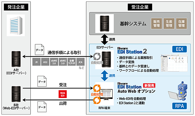 Auto Webオプションは、これまで人手を必要としていたWeb-EDIの受注業務を、RPAの技術で自動化する機能。各種通信手順によるEDI取引については、EDI Station 2の標準機能であるワークフロー作成機能を利用して受注業務を自動化することが可能。EDI Station 2とAuto Webオプションを併用することで、通信手順によるEDIからWeb-EDIまで、受注業務のあらゆるEDI処理を自動化できる。