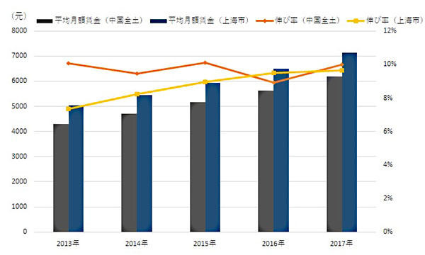 中国国家統計局によると、中国国内の平均月額賃金は2013年以降、毎年10%前後の割合で伸びている。上海も同様で、上海市政府によると、13年に約5000元(約8万円)だった月額平均賃金は、17年は7000元(約11万円)を超えた。